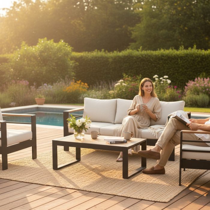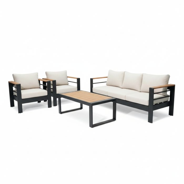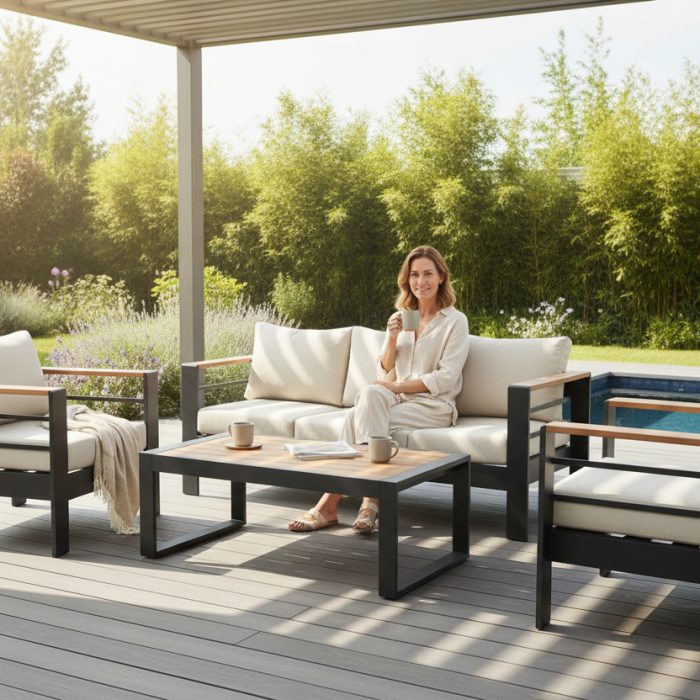 Bộ sofa ngoài trời kèm bàn coffee được thiết kế theo phong cách hiện đại – tối giản, đáp ứng tiêu chuẩn thẩm mỹ và độ bền cho thị trường EU, UK.