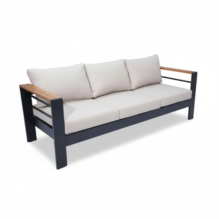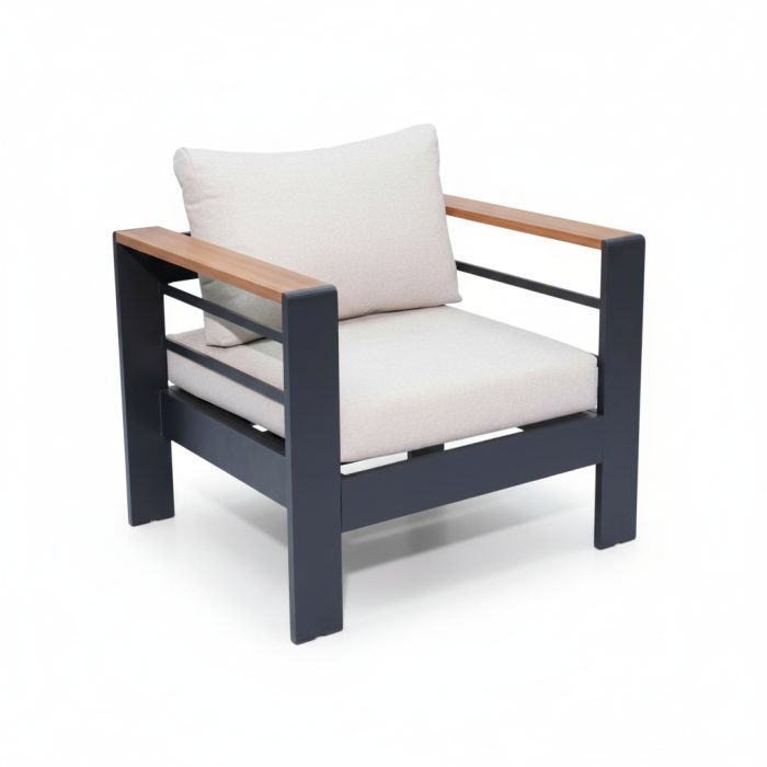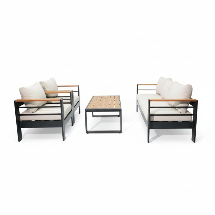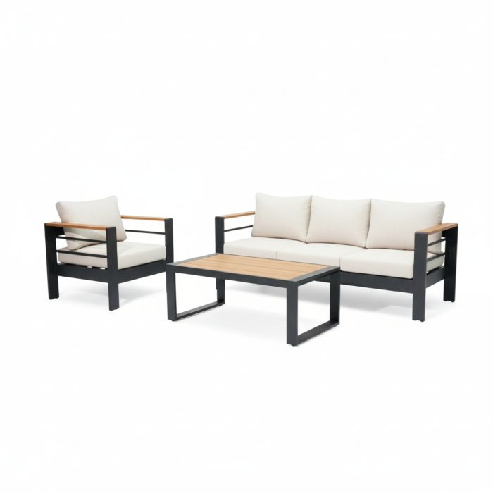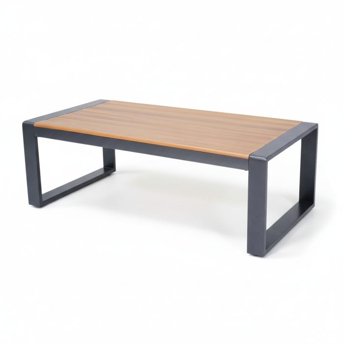 Khung sản phẩm sử dụng kim loại chắc chắn, phủ sơn tĩnh điện, giúp chống gỉ sét, chống ăn mòn và phù hợp với điều kiện sử dụng ngoài trời. Phần tay ghế và mặt bàn coffee được hoàn thiện bằng giấy dán vân gỗ (decorative paper laminate), mang lại vẻ ngoài ấm áp như gỗ tự nhiên nhưng ổn định màu sắc, dễ vệ sinh và tiết kiệm chi phí, rất phù hợp cho sản phẩm xuất khẩu và sử dụng thương mại.